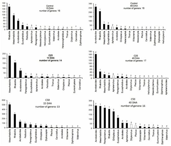 The c–p value, the trophic type and the abundance of each nematode genus are presented in Figure 5 as rank abundance graphs for each treatment and both treatment durations; all treatments presented similar numbers of genera (13–17) while in 40DAA the numbers were found to be more elevated in the whey treatments, in comparison to those recorded 15DAA. In 15DAA all samples were characterized by the over-dominance of c-p1 bacterial-feeding nematodes, Rhabditis in the control and Mesorhabditis in C50 and C25 treatments. In 40DAA the pattern was different as in all treatments the c-p2 bacterivore nematode Acrobeloides was the dominant genus. Moreover, in the C50 treatment the nematode community was no longer characterized by the dominance of one single genus but a more equally distributed community was observed, involving c-p1 as well as c-p2 nematode genera (Acrobeloides, Mesorhabditis, Rhabditis, Panagrolaimus).
