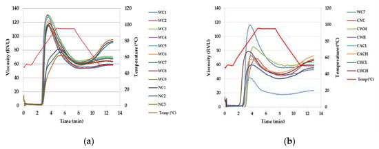 - Sánchez, T.; Dufour, D.; Moreno, I.X.; Ceballos, H. Comparison of pasting and gel stabilities of waxy and normal starches from potato, maize, and rice with those of a novel waxy cassava starch under thermal, chemical, and mechanical stress. J. Agric. Food Chem. 2010, 58, 5093–5099. [Google Scholar] [CrossRef]