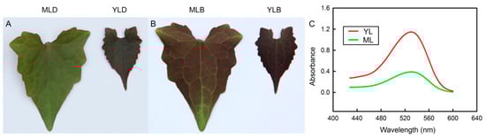 The morphology characteristics of leaves. (A) Adaxial surfaces of the mature leaves (MLD) and young leaves (YLD). (B) Abaxial surfaces of the mature leaves (MLB) and young leaves (YLB). (C) The absorbance of anthocyanin from mature leaves (ML) and young leaves (YL) (n = 5).