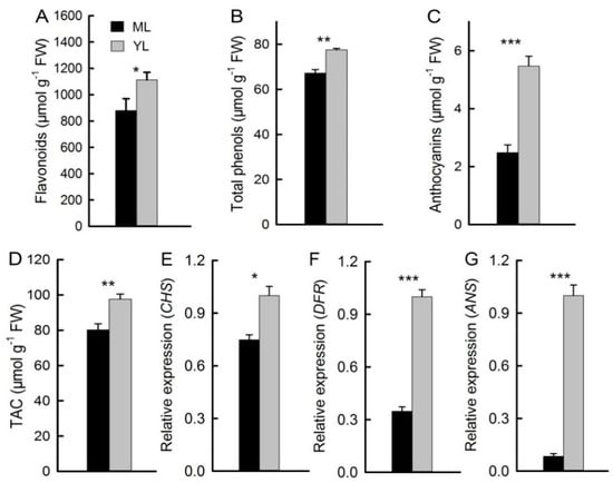 Antioxidant content of the leaves. Contents of flavonoids (A), total phenols (B), and anthocyanins (C) of ML and YL (n = 5). Total antioxidant capacity (TAC) of ML and YL (G) (n = 5). Relative expression of genes related to anthocyanin biosynthesis chalcone synthase (CHS), dihydroflavonol 4-reductase (DFR), and anthocyanidin synthase (ANS) (D–F) in ML and YL (n = 6). The error bars represent standard errors for five to six biological replicates. Asterisks indicate different significant differences (* P < 0.05, ** P < 0.01, *** P < 0.001) according to two-sided Student’s t-tests.
