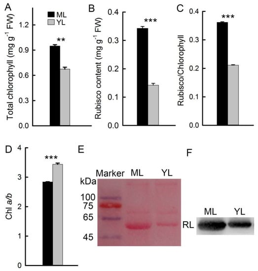 Contents of protein and chlorophyll. Contents of total chlorophyll (Chl) (A) and Rubisco (B) of ML and YL (n = 5). The values of Rubisco/chlorophyll (C) and Chl a/b (D) of ML and YL (n = 5). Ponceau-stained membrane before Western blot analysis (E) and the Western blotting analyzed Rubisco large subunit (RL) of ML and YL (F). The error bars represent standard errors for five biological replicates. Asterisks indicate different significant differences (** P < 0.01, *** P < 0.001) according to two-sided Student’s t-tests.