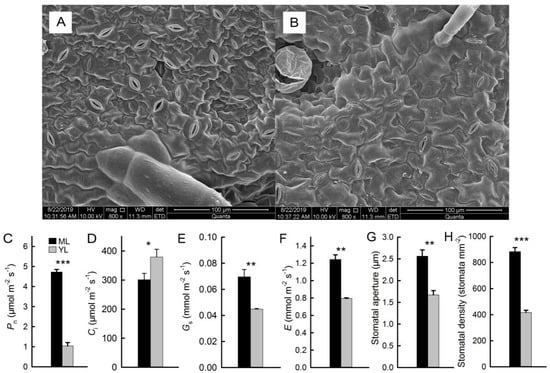 Stomata and gas exchange of leaves. Phenotypic characteristics of stomata in ML and YL (A,B). The net photosynthetic rate (Pn) (C), intercellular carbon dioxide concentration (Ci) (D), stomatal conductance (Gs) (E), and transpiration rate (E) (F) of ML and YL (n = 10). Stomatal aperture and density (G,H) of ML and YL (n = 5). The error bars represent standard errors for ten biological replicates. Asterisks indicate different significant differences (* P < 0.05, ** P < 0.01, *** P < 0.001) according to two-sided Student’s t-tests.