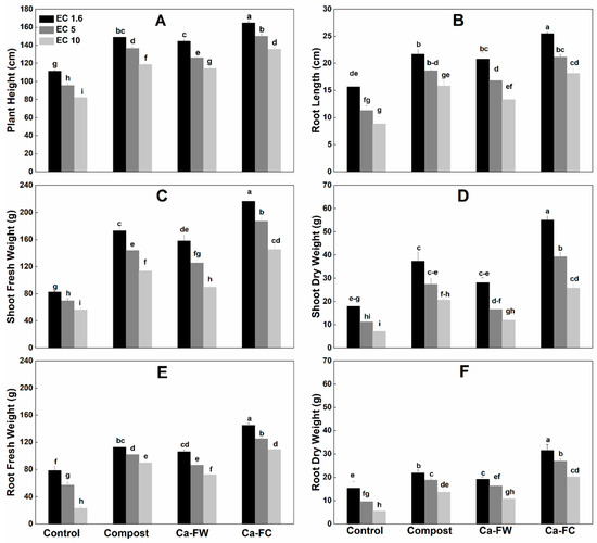 Regarding plant height, the application of Ca-FC caused a significant increase in plant height (i.e., 63.33%, 58.5%, and 53.66% at EC levels of 1.6, 5, and 10 dS m−1, respectively) as compared to the control treatment. It was followed by the individual application of compost and Ca-FW. An increase of 51%, 39%, and 25.33% in plant height compared to the control treatment, was recorded with the individual application of compost at EC levels of 1.6, 5, and 10 dS m−1, respectively. Similarly, application of Ca-FW alone increased plant height up to 50%, 45.83%, and 35.66% at EC levels of 1.6, 5, and 10 dS m−1, respectively as compared to the control treatment.