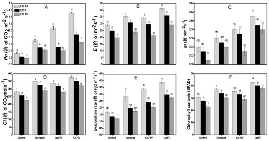 Data regarding physiological parameters (Figure 2A–F) indicate that individual application of compost caused a slight increase in photosynthetic rate by 19%, 11%, and 6% at EC levels of 1.6, 5, and 10 dS m−1, respectively, compared to the control treatment. However, the application of Ca-FC caused the maximum increase in photosynthetic rate by 67%, 43%, and 35% at EC levels of 1.6, 5, and 10 dS m−1, respectively as compared to the control treatment. Similarly, the maximum increase in stomatal conductance was recorded with the application of Ca-FC (i.e., 56.16%, 42.39%, and 34.11% at EC levels of 1.6, 5, and 10 dS m−1, respectively in comparison to the control treatment. In the same way, application of Ca-FC caused the maximum increase in evaporation rate up to 138.03%, 129.16%, and 116.78% at EC levels of 1.6, 5, and 10 dS m−1, respectively as compared to the control treatment. A similar trend was observed in the case of transpiration rate. Likewise, the maximum increase in internal CO2 concentration was observed with the application of Ca-FC by 42.145, 35.68%, and 32.62% at EC levels of 1.6, 5, and 10 dS m−1, respectively compared to the control treatment.