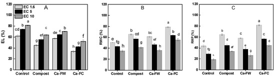 In the case of stem diameter, application of compost or Ca-FW alone showed a small increase at EC levels of 1.6, 5, and 10 dS m−1 compared to the control (Table 1). The maximum increase in stem diameter was observed with the application of Ca-FC (i.e., 68.21%, 64.10%, and 51.70% at EC levels of 1.6, 5, and 10 dS m−1, respectively) as compared to the control treatment. Likewise, application of Ca-FC showed the maximum increase in the number of plant leaves by 57.97%, 52.42%, and 45.87% over the control treatment at EC levels of 1.6, 5, and 10 dS m−1, respectively. Moreover, application of Ca-FC caused the maximum and statistically significant improvement in leaf area by 51.21%, 49.23%, and 47.86% at EC levels of 1.6, 5, and 10 dS m−1, respectively as compared to the control treatment.