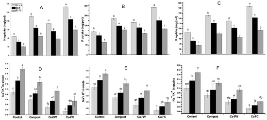 Effect of compost, Ca-FW, and Ca-FC on nutrients homeostasis of maize (Zea mays L.) under saline–sodic soil conditions. (Note: Ca-FW = calcium based fertilizer industry waste; Ca-FC = calcium-fortified compost. Quantities sharing similar letters are statistically different from each other at p ≤ 0.05.
