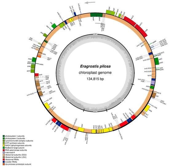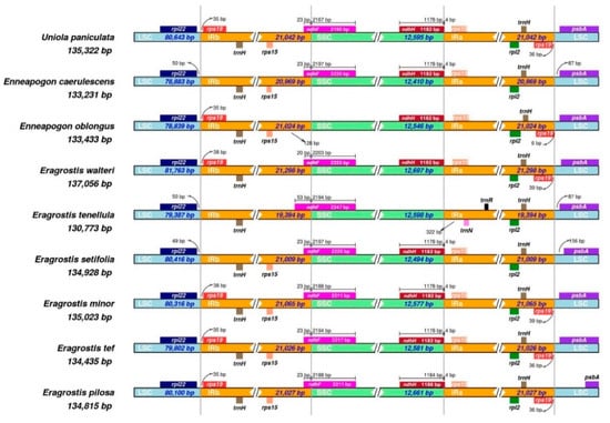 Fresh E. pilosa leaves were collected at Yan’an, Shaanxi, China (179° 36°39′20″ N 109° 24′26″ E). Total genomic DNA was extracted from silica-dried leaves using the modified cetyltrimethylammonium bromide (CTAB) method []. Purified DNA was used for paired-end library preparation with Illumina Paired-End DNA library Kit according to the manufacturer’s protocol (Illumina, CA, USA). Genomic DNA was sequenced on a HiSeq X Ten platform. Eight other species of Eragrostideae were used for comparative analysis (E. tef (NC_029413), E. minor (NC_029412), E. setifolia (NC_042832), E. tenellula (NC_042833), E. walteri (NC_035528), En. caerulescens (NC_042837), En. oblongus (NC_036682), U. paniculata (NC_036709)).