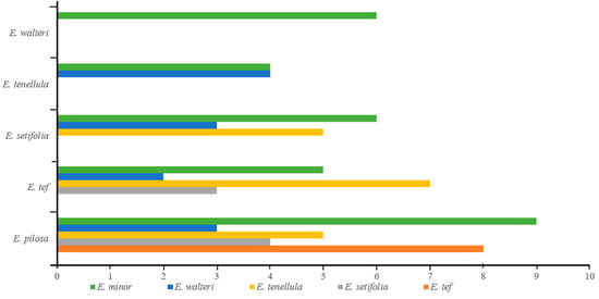 Shared SSRs among Eragrostis species were calculated by aligning homologous regions in each pair of cp genomes. E. pilosa and E. minor shared the most SSRs (9), while E. tef and E. walteri shared the least (2). E. pilosa shared eight, four, and five SSRs with E. tef, E. setifolia, and E. tenellula, respectively, while E. tef and E. minor shared five (Figure 3 and Table S3). Ten E. pilosa SSRs were randomly selected, and primers were designed that can be used in future studies of the genetic diversity and population structure of these species (Table S4).