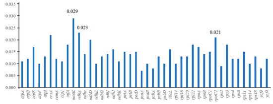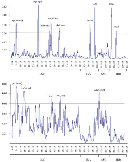 Chloroplasts are essential plant cell organelles that convert solar energy to usable chemical energy []. They are involved in the synthesis of most leaf proteins, fatty acids, amino acids, and secondary metabolites. The chloroplast enzyme ribulose-1,5-bisphosphate carboxylase (RbcL) is the most abundant protein on earth, and it is widely used in evolutionary studies of plants []. During evolution, specific cp genes have been lost in various species, genera, and families []. Therefore, comparing the cp genomes of plant species is useful to understand their evolutionary processes over time. The development of advanced technologies for cp genome sequencing has allowed many research groups to produce complete cp DNA sequences. In addition, no single DNA barcode exists that can distinguish all angiosperms from each other. Therefore, many recent studies have been conducted to detect appropriate barcodes to identify species, genera, and families using complete cp sequences [].