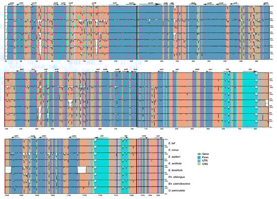 Sequence alignment plot comparing four cp genomes with E. pilosa as a reference. Genome regions are color coded as protein coding, rRNA coding, tRNA coding or conserved noncoding sequences. The vertical scale indicates the percentage identity, ranging from 50% to 100%.