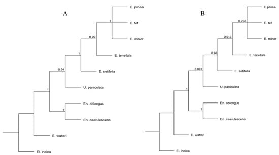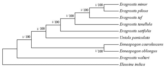The nine Eragrostideae species and the outgroup species Eleusine indica (NC_030486) from Cynodonteae were used for phylogenetic analysis. Similar topologies were observed in maximum likelihood (ML) and Bayesian inference (BI) generated trees based on complete cp genome sequences, with high bootstrap values for almost all relationships. E. pilosa was in the same clade as E. minor, and both were sisters of E. tef (Figure 7). BI trees based on highly divergent regions (rps16-trnQ + trnL+ rbcL-psaI) and 30 protein-coding genes of length > 600 bp were identical with high posterior probability values, and E. pilosa, E minor, and E. tef clustered together (Figure 8). All Eragrostis species except E. walteri had close relationships in all analysis. E. walteri was in the basal position followed by the Enneapogon species.