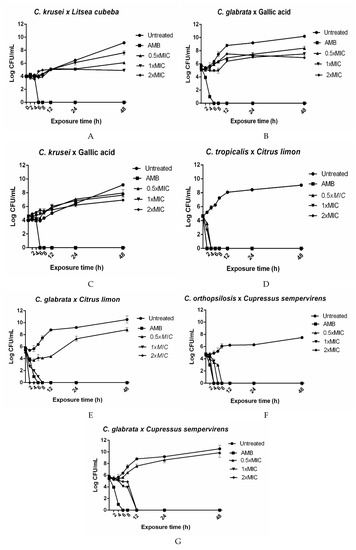 Kill assays for plant-derived products against Candida species. The concentrations 0.5 × MIC, 1 × MIC, and 2 × MIC correspond to: (A) Litsea cubeba × C. krusei: 31.25, 62.5, and 125 µg/mL; (B) Gallic acid × C.glabrata 31.25, 62.5, and 125 µg/mL; (C) Gallic acid × C. krusei: 62.5, 125, and 250 µg/mL; (D) Citrus limon × C. tropicalis: 125, 250, and 500 µg/mL; (E) Citrus limon × C. glabrata: 125, 250, and 500 µg/mL; (F) Cupressus sempervirens × C. orthopsilosis: 15.62, 31.25, and 62.5 µg/mL; (G) Cupressus sempervirens × C. glabrata: 15.62, 31.25, and 62.5 µg/mL. AMB: 4 µg/mL amphotericin B and Untreated: Candida species’ growth without plant-derived products. The results are expressed as the mean colony-forming units (CFU)/mL ± standard deviation from three independent experiments.