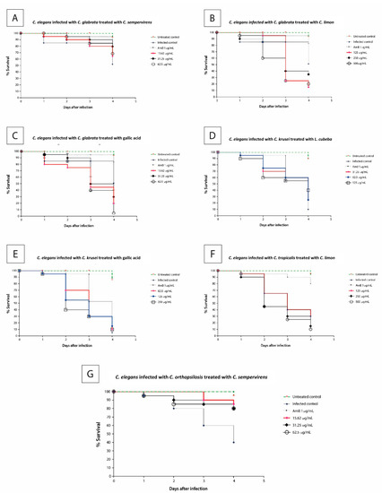 Survival curves of the responses to the tested compound concentrations from the Caenorhabditis elegans–Candida infected model. Nematode survival diminished at 0.5 × MIC, 1 × MIC, and 2 × MIC for all the compounds, except for the Cupressus sempervirens EO. (A)—C. elegans infected with C. glabrata and treated with C. sempervirens EO, (B)—C. elegans infected with C. glabrata and treated with C. limon EO, (C)—C. elegans infected with C. glabrata and treated with gallic acid, (D)—C. elegans infected with C. krusei and treated with L. cubeba EO, (E)—C. elegans infected with C. krusei and treated with gallic acid, (F)—C. elegans infected with C. tropicalis and treated with C. limon, (G)—C. elegans infected with C. orthopsilosis and treated with C. sempervirens. The untreated control group is represented by the green lines; the infected control, the fungicidal control drug (amphotericin B), and the different concentrations of the tested compounds are represented by symbols. The results were obtained from three independent experiments with at least three replicates.