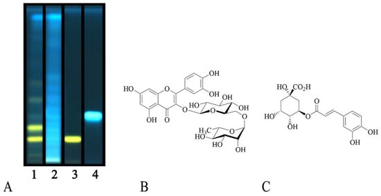 (A) High performance thin-layer chromatography (HPTLC) analysis of the ethyl acetate fractions of investigated plants. Mobile phase: Ethyl acetate/dichloromethane/acetic acid/formic acid/water (100:25:10:10:11, v/v/v/v/v). Visualization—366 nm, derivatization—Natural Product Reagent (NPR). Tracks: 1, C. album L.; 2, S. officinale (L.) Scop.; 3, rutin; 4, chlorogenic acid. (B) Rutin. (C) Chlorogenic acid.