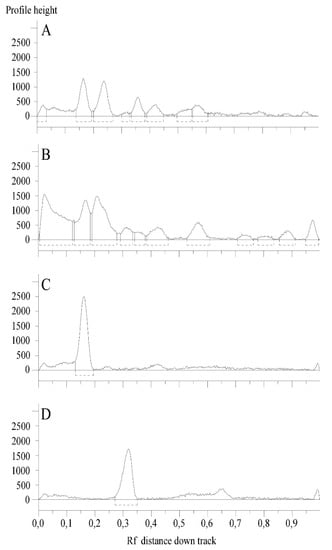 Samples and reference compounds were dissolved in methanol to a final concentration of 50 and 3 mg/mL, respectively, and spray-applied with a micro-syringe on 20 × 10 cm silica gel glass plates (silica 2–10 µm; 2 μm thickness). Operating conditions were the same as previously described []. Plates were developed using a mixture of ethyl acetate/dichloromethane/acetic acid/formic acid/water (100:25:10:10:11, v/v/v/v/v). For post-chromatographic derivatization, plates were dipped in freshly prepared NPR reagent and anisaldehyde reagent, and heated at 100 °C for 5 min. The first reagent was prepared by dissolving diphenylborinic acid aminoethyl ester (1 g) in AcOEt (200 mL). The second one by mixing p-anisaldehyde (1.5 mL), sulfuric acid (2.5 mL), AcOH (1 mL), and ethanol (37 mL). The plates were examined before and after derivatization under UV light (254 or 366 nm) and white light. Samples were analyzed by co-chromatography with the reference compounds rutin, chlorogenic acid, cinnamic acid, caffeic acid, sinapic acid, p-coumaric acid, naringenin, quercetin, kaempferol, luteolin, ferulic acid, catechin, and naringin.