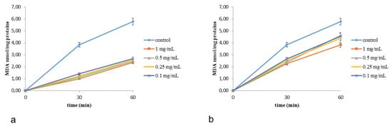 The capacity of C. album and S. officinale extracts to protect against lipid peroxidation, induced by tert-butyl hydroperoxide (tert-BOOH), was evaluated in rat-liver microsomes for one hour [,,]. The antioxidant efficiency of extracts were time-dependent and evaluated as MDA production (in nmol mg−1 protein, Figure 3). The obtained results indicated that all extracts are effective antioxidants against tert-BOOH-induced lipid peroxidation, showing a preservation of their efficacy up to one hour.