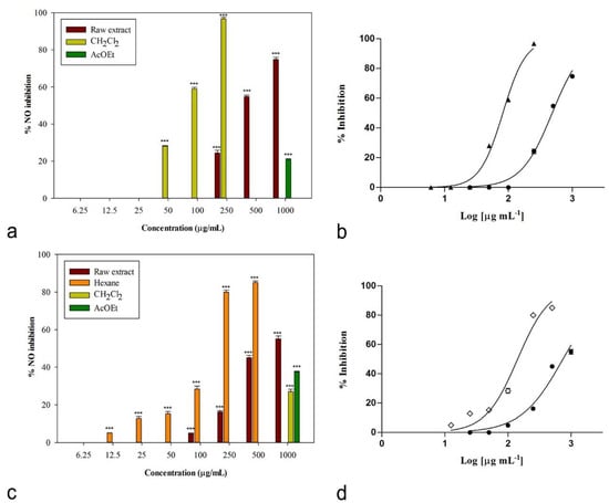 (a) Nitric oxide production inhibition induced by Chenopodium album L. (b) Non-linear regression analyses: ● raw extract, ▲ CH2Cl2 fraction. (c) Nitric oxide production inhibition induced by Sisymbrium officinale (L.) Scop. and (d) non-linear regression analyses: ● raw extract, ◊ n-hexane fraction. Data were expressed as means ± S.E.M. (n = 4). *** P < 0.001 compared to control (Dunnett’s test).
