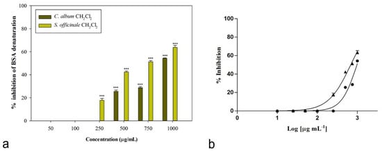 Then, the potential role of C. album and S. officinale extracts in the treatment of arthritic disorders was assessed in vitro through the evaluation of their capacity to protect bovine serum albumin from heat denaturation. The denaturation of tissue proteins is a major cause of arthritic diseases. Thus, agents able to prevent protein denaturation could be useful for the development of new anti-inflammatory drugs [].