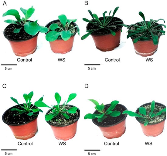 Effect of the 1 month water stress treatment (WS) in the four Limonium species under study: L. santapolense (A), L. virgatum (B), L. girardianum (C), and L. narbonense (D).