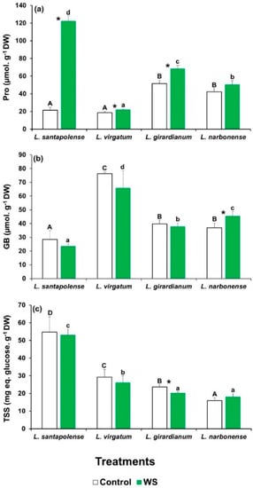 The leaf GB contents in the control plants were similar to those of Pro (20–50 µmol g−1 DW), except for L. virgatum, in which a concentration of 76 µmol g−1 DW was determined. These values only slightly varied in general, and not significantly, in the plants subjected to the water deficit treatment (Figure 2b).