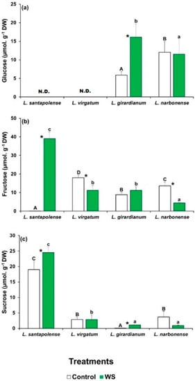 To check the possibility that the leaf levels of particular sugars could vary in response to the water deficit treatment, which cannot be detected by measuring TSS contents, soluble carbohydrates in aqueous extracts of plants were separated, identified, and quantified by HPLC (Figure 3). Three major peaks in the chromatograms were observed, corresponding to glucose (Glu), fructose (Fru), and sucrose (Suc), but their concentrations showed entirely different patterns in the four analyzed Limonium species. Glu was detected only in L. giradianum and L. narbonense, but its concentration increased significantly in response to drought only in the former species by reaching 15.5 µmol g−1 DW (Figure 3a). In L. santapolense and L. virgatum, glucose levels were below the detection limit of the evaporative light scattering detector (ELSD), both in control and stressed plants. Fru concentrations were very low (<0.5 µmol g−1 DW) in the non-stressed L. santapolense plants, and increased considerably to ca. 38 µmol g−1 DW in response to water stress. The other three species had higher control Fru values (8–17 µmol g−1 DW), which either lowered or did not change significantly in the stressed plants (Figure 3b). Large differences in leaf Suc contents were also detected in the control plants of the four analyzed species, which went from extremely low values (<0.2 µmol g−1 DW) in L. giradianum to 2.2–2.4 µmol g−1 DW in L. narbonense and L. virgatum, and to ~17 µmol g−1 DW in L. santapolense. In the latter species, water deficit stress induced a significant increase of 1.4-fold in the Suc concentration (Figure 3c), which was much lower than that observed for Fru in any case (Figure 3b).