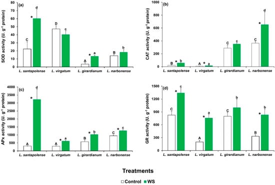 Activity of the antioxidant enzymes in the leaves of the four studied Limonium species after 1 month of water stress treatment (WS) and in the control plants. The graphs show the specific activities of (a) superoxide dismutase (SOD), (b) catalase (CAT), (c) ascorbate preoxidase (APX), and (d) glutathione reductase (GR) as mean values with SE (n = 5). Different letters above the bars indicate significant differences between species, for control (capital letters) and water-stressed (lower-case letters) plants. Asterisks denote significant differences between treatments for each species, according to the Tukey test (α = 0.05).