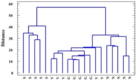 Clustering of the analyzed Limonium species: L. santapolense (S.), L. virgatum (V.), L. girardianum (G.), and L. narbonense (N.), by the nearest neighbor method, on the basis of squared Euclidean distances according to all the parameters registered in the water-stressed plants.