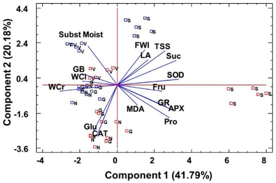Principal component analysis (PCA). Changes in growth parameters, osmolyte levels, and antioxidant enzyme activities in the plants grown under water stress conditions for 1 month (red squares) versus the corresponding controls (blue squares); the non-stressed plants of the investigated Limonium species: L. santapolense (S.), L. virgatum (V.), L. girardianum (G.), and L. narbonense (N.), in correlation to substrate moisture. Each square corresponds to an individual analyzed plant. FWL, leaf fresh weight; LA, leaf surface area; WCL, water content percentage in leaves; WCR, water content percentage in roots; Pro, proline; GB, glycine betaine; TSS, total soluble sugars; Glu, glucose; Fru, fructose; Suc, sucrose; MDA, malendialdehyde; SOD, superoxide dismutase; CAT, catalase; APX, ascorbate peroxidase; GR, glutathione reductase.