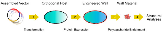One recent approach that allows for the reconstruction of a whole functional biosynthetic machinery is synthetic biology (Figure 1), whereby multiple genes are expressed in an orthogonal organism that does not contain the polysaccharide structure of interest [12]. The study of GTs in orthogonal unicellular systems provides higher-throughput, faster genetic engineering, and reduced glycan complexity compared to plants. While in vitro assays of purified proteins provide the cleanest background and have been instrumental to elucidating GT activities [2], the synthetic biology strategy outlined in Figure 1 bypasses time-consuming protein extraction and solubilization steps, and offers superior polysaccharide yields. Furthermore, orthogonal hosts could be exploited to produce “fit for purpose” polysaccharides (e.g., for functional foods and fibers) and to monitor their dynamics, two objectives that remain technically challenging in plants [13,14,15]. Plant polysaccharide-based nanocomposites already have a variety of industrial applications [16], including drug delivery, so gaining the ability to tailor glycan structures and attributes is of high biotechnological value.