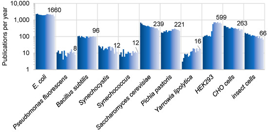 Publications on recombinant proteins in different expression hosts in the last 15 years. The graph shows, as a proxy for the popularity of a particular expression system, the number of publications indexed in the PubMed.gov database from 2003 (dark blue) to 2018 (light blue) that matched the (“X axis label” recombinant protein) search, performed on November 6, 2019. The vertical axis shows a log scale (base 10), and the data labels on the chart represent the 2018 publication count for each host. Only 73 total matches (over 15 years) were found for Ustilago maydis, and are thus not shown in the graph.