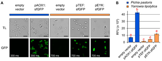 Although recombinant protein expression has been tested in all the organisms outlined in Table 1 and Figure 2, there are relatively few side-by-side comparisons and pilot experiments are likely required to compare two species for a specific application. As a proof-of-concept, we directly compared the suitability of Pichia and Yarrowia using the superfolder green fluorescent protein (sfGFP) as a reporter (Figure 3). In Pichia, the transgene was expressed under control of the methanol-inducible ALCOHOL OXIDASE 1 promoter (pAOX1), which is readily available in a range of vectors from AddGene or commercial suppliers (e.g., Invitrogen, Thermo Fischer Scientific). For Yarrowia, we tested the common pTEF promoter, which is constitutive [96], and the pEYK300A3B (pEYK) hybrid promoter, which is erythritol-inducible and is reported to result in five-fold higher expression than pTEF [97]. After direct cultivation in an appropriate medium containing the inducer, both yeast species showed sfGFP fluorescence when the transgene was expressed compared to empty vector controls (Figure 3A). The relative fluorescence of sfGFP proteins expressed in Pichia was visibly stronger than in Yarrowia, and hence a two-fold lower exposure time was used to avoid signal saturation in the Pichia micrographs. Furthermore, the relative fluorescence of the sfGFP recombinant protein was quantified with a plate reader and normalized to the optical density (OD600) of the cells (Figure 3B). Based on our cultivation conditions and the sfGFP reporter protein, we observed a three-fold increase in fluorescence intensity using pEYK instead of pTEF (Figure 3B). It is noteworthy that despite the advantage of Yarrowia for the synthesis of galactose-containing polymers (Table 2), the relative intensity sfGFP expressed in Pichia under the control of the pAOX1 promoter was several fold higher than even the Yarrowia pEYK construct. An additional consideration for many Yarrowia strains is that zeta elements found in popular vectors enable random chromosomal integration [98], which results in varying levels of protein expression. A 2018 study also showed that Yarrowia can also efficiently integrate multi-gene biochemical pathways in a homology-independent manner [99]. Despite the need to screen a larger number of colonies than in Pichia, a benefit of this random integration is that clones with different expression levels can be isolated with a single promoter and that subsequent rounds of transformation are unlikely to integrate in the same locus, thus enhancing pathway engineering.