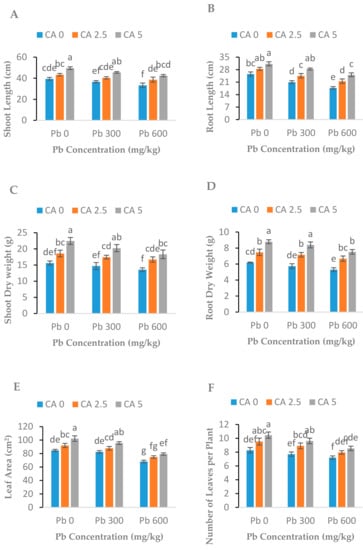 Effect of different Pb concentrations (0, 300, and 600 mg kg−1) and CA levels (0, 2.5, and 5 mM) on shoot lengths (A), root lengths (B), shoot dry weight (C), roots dry weight (D), leaf area (E), numbers of leaves per plant (F) of castor beans plants. Values reported in figures are the mean of 3 replicates along with standard deviation. Letters show the significant difference between the treatments of p ≤ 0.05.