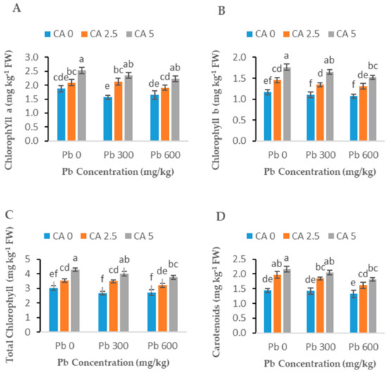 Effect of different Pb concentrations (0, 300, and 600 mg kg−1) and CA levels (0, 2.5, and 5 mM) upon chlorophyll a content (A), chlorophyll b content (B), chlorophyll total (C), and the carotenoids content (D) of castor beans plants. Values reported in figures are the mean of 3 replicates along with standard-deviation. Letters show the significant difference between the treatments of p ≤ 0.05.