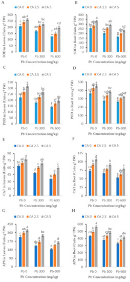 Effect of different Pb concentrations (0, 300, and 600 mg kg−1) and CA levels (0, 2.5, and 5 mM) on leaf SOD content (A), roots SOD content (B), leaf POD content (C), roots POD content (D), leaf CAT content (E), roots CAT content (F), leaf APX content (G), roots APX content (H) of castor beans plants. Values reported in figures are the mean of 3 replicates along with standard deviation. Letters show the significant difference between the treatments of p ≤ 0.05.