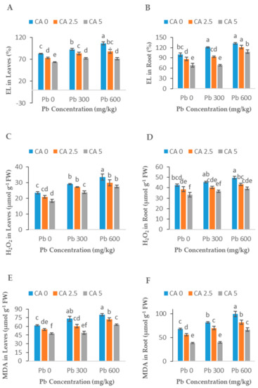 Effect of different Pb concentrations (0, 300, and 600 mg kg−1) and CA levels (0, 2.5, and 5 mM) on EL in leaf (A), EL in roots (B), leaf H2O2 content (C), roots H2O2 content (D), leaf MDA content (E), roots MDA content (F) of castor beans plants. Values reported in figures are the mean of 3 replicates along with standard deviation. Letters show the significant difference between the treatments on p ≤ 0.05.
