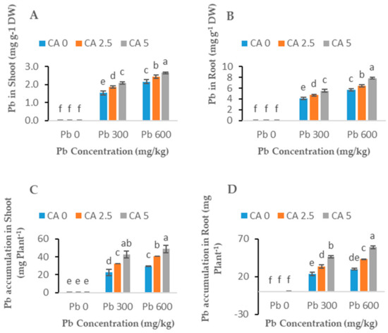 Concentrations of Pb in roots and shoots of castor beans plants exposed to different levels of Pb along with applications of CA are shown in Figure 6. Our results clearly explained that Pb uptake increased with increasing concentrations of applied Pb in the system of soil. It is well observed that the accumulation of Pb in different parts of the plant correlates with the concentration of Pb in growth media [47]. Our results clearly showed that the concentration of Pb were significantly higher in roots as compared with the aerial parts of the plant. Similar results have been reported by many researchers [10,13,47]. That might be due to the ability of Pb to make complexes with polysaccharides such as sugar and other macromolecules.