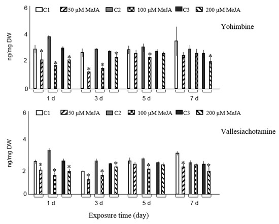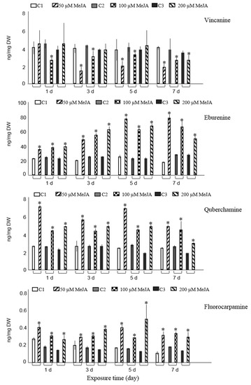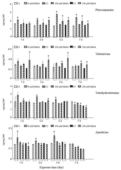 The GC-MS results revealed that all three concentration levels (50 µM, 100 µM, 200 µM) of MeJA statistically (student’s t test, p < 0.05) improved the accumulation of eburenine, fluorocarpamine, and quebrachamine at four different periods as compared with control cultures (Figure 1). The same tendency was found for pleiocarpamine, except for hairy roots that were exposed to 100 µM MeJA over a three-day period or treated with 200 µM MeJA for one day.