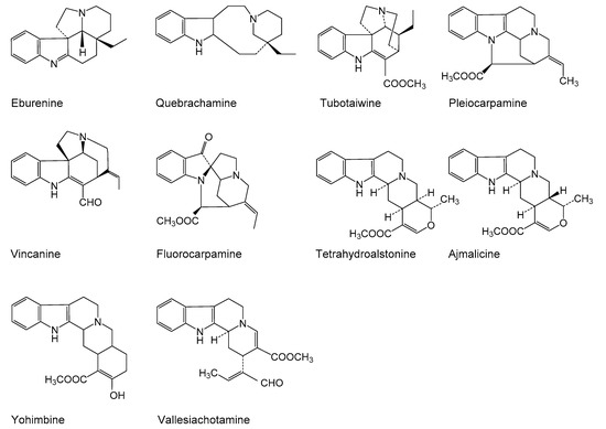 - Pawelka, K.H.; Stöckigt, J. Major indole alkaloids produced in cell suspension cultures of Rhazya stricta Decaisne. Z. Naturforsch.–Sect. C J. Biosci. 1986, 41, 385–390. [Google Scholar] [CrossRef]