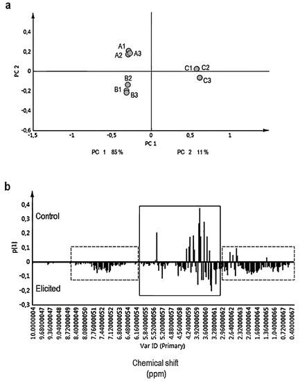 (a) Principal component analysis (PCA) score plot and (b) loading column plot based on 1H-NMR data from R. stricta hairy roots exposed to 50 μM (A1, A2, A3) and 100 μM (B1, B2, B3) MeJA for three days. In control cultures (C1, C2, and C3) equal volumes of 40% ethanol were applied (the same volume of 100 μM MeJA). All samples were in triplicate. Elicited samples were effectively separated by PC1 (a). The column plot (b) shows higher levels of aromatics (δ 6.00–δ 10.00 ppm) and organic/amino acids (δ 0.00–δ 3.00 ppm) (dashed lines) in elicited hairy root cultures than controls. Continuous line indicates different sugar and fatty acid profiles in elicited and control hairy root cultures.