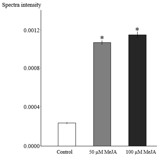 Comparison of total vindoline-type alkaloid based on 1H-NMR data in MeJA-elicited (50 and 100 μM, for three days) R. stricta hairy roots and control cultures (equal volumes of 40% ethanol were added as in 100 µM MeJA). The sum of the values of spectral intensity from 1H NMR bucket data in the region δ 0.49–δ 0.54 (ppm) was used for quantification of total vindoline-type alkaloids. Pairwise comparison of means from two groups (control versus elicited sample) is presented as mean ± SD of three samples for each treatment. * indicates significant difference in the mean between control and elicited sample (student’s t test, p < 0.05).