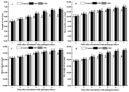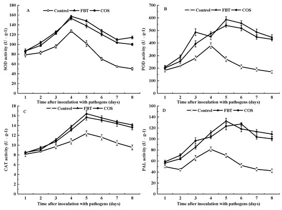 3.3. Effect of FBT and COS on Enzymatic Activities of Root
