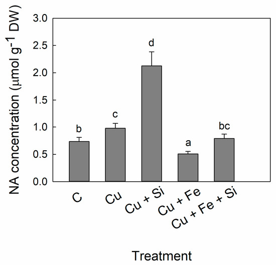 Concentration of nicotianamine (NA) in cucumber leaves. Plants were harvested after 5 days of treatment with excess Cu (Cu), excess Cu and Si supply (Cu + Si), excess Cu and additional Fe supply (Cu + Fe) or combined excess Cu and additional Fe and Si supply (Cu + Fe + Si); control plants (C) remained untreated. Bars are means of four replicates ± SD. Different letters indicate significant differences among the treatments at p < 0.05.