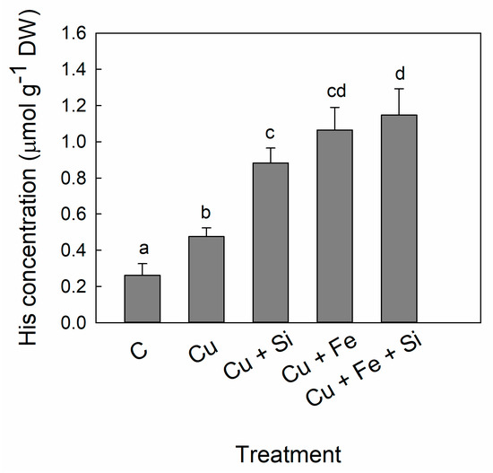 A continuous increase in His concentration was found in all treatments starting from Cu (1.8-fold) to Cu + Fe + Si treatment (5.4-fold) compared to control values (Figure 3).
