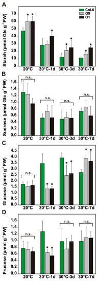 2.4. Improved 2-PG Degradation Translates to Higher Transitory Starch Stocks under Temperature Stress