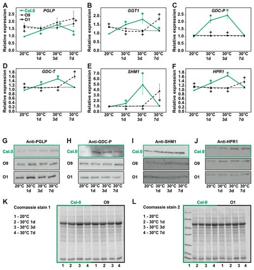 2.6. Expression of Photorespiratory Proteins Increases after High Temperature Exposure in Wild Type but not in PGLP Overexpressor Lines