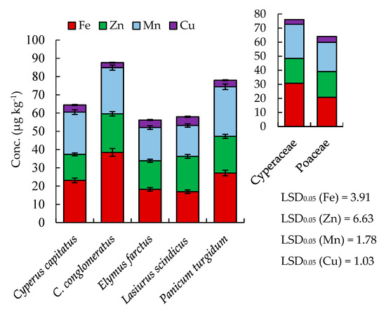 Chicago/Turabian StyleAl-Rowaily, Saud L., Ahmed M. Abd-ElGawad, Suliman M. Alghanem, Wafa’a A. Al-Taisan, and Yasser A. El-Amier. 2019. "Nutritional Value, Mineral Composition, Secondary Metabolites, and Antioxidant Activity of Some Wild Geophyte Sedges and Grasses" Plants 8, no. 12: 569. https://doi.org/10.3390/plants8120569