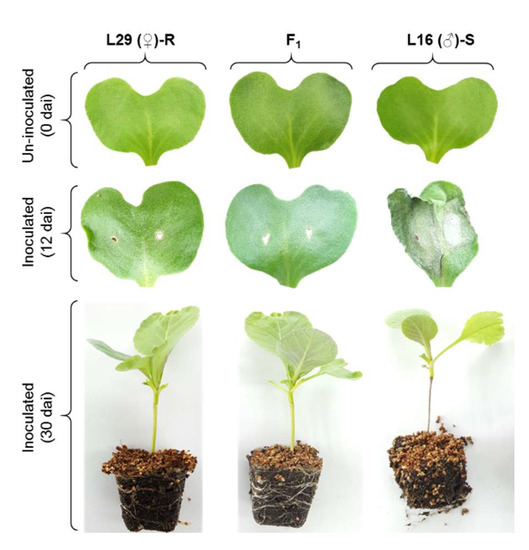 A segregating BC1 population consisting of 253 plants was developed from the resistant and susceptible cabbage lines, L29 (♀) and L16 (♂), respectively. In addition, 30 commercial cabbage lines were used for validation of the developed markers. All these plant materials were obtained from Asia Seeds Ltd., Seoul, Republic of Korea. Seeds were germinated on commercial nursery soil mix in a controlled plant growth chamber at 25 ± 2 °C, 16 h day length and 440 μmoles/m2/s light intensity at bench level.