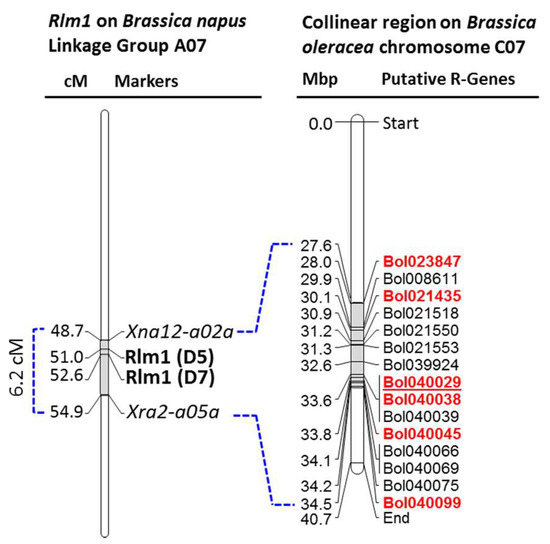 Research on blackleg disease was mainly focused on A- and B-genome crops, with all the known R- loci (a total of 19 race-specific R-genes) being identified in the A genomes of B. rapa [31,32] and B. napus [33,34,35,36,37,38,39] and in the B genomes of B. nigra, B. carinata, and B. juncea [34,40,41,42]. A few major loci include the LepR1 on B. napus linkage group A02; Rlm1, Rlm3, Rlm4, Rlm7, and Rlm9 on A07; Rlm2, BlmR2, and LepR3 on A10 [18,41,43]; LepR2 on linkage group A02 [44]; rjlm2 in B. napus [45]; LMJR2 on LG J18 of B. juncea [40] and LepR4 on A06 of B. napus [18,46] etc.