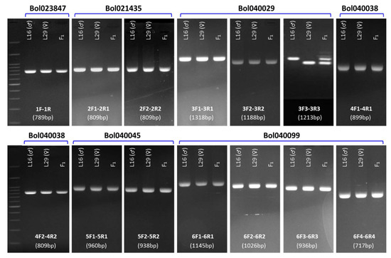 Detection of length polymorphism between the resistant (L29) and susceptible (L16) cabbage lines in the six selected genes via PCR assay. Primer combinations and product size for each gel are shown in the bottom. Visible length polymorphism is observed in the gene Bol040029 by the primer pair’s 3F3–3R3. Details of the genes and corresponding primer specifications can be found in Table 2 and Table 3, respectively.