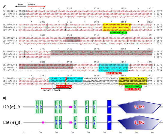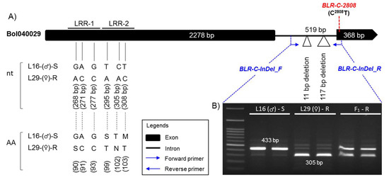 One InDel marker, BLR-C-InDel, based on the 2508–2518 bp and 2597–2713 bp (total 128 bp) deletionS in the intronic region and one high resolution melting (HRM) marker, BLR-C-2808, based on the SNP C2808T in the second and last exon of the LRR-RLK gene Bol040029 were developed (Table 4; Figure 5A). The InDel marker BLR-C-InDel generated 433 bp and 305 bp amplicon from the susceptible and resistant parental lines, respectively, and a heterozygous amplicon for the F1 hybrid in PCR assay (Figure 5). The HRM marker BLR-C-2808 generated a melting peak at 55 °C and 63 °C for the resistant (T/T) and susceptible (C/C) alleles, respectively, and both peaks for the heterozygous (T/C) alleles (Figure S6).